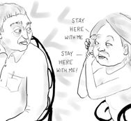 Ch. 6 Everyday Rituals. Through a number of everyday rituals—opening the mail, wordplay, and jokes at mealtime and potty time—Dad maintains a surprising levity despite the hardships of advanced age. I worry that that our graphic memoir project focusing on his artwork might actually bring back the painful desire for recognition when he finally seems free of care.